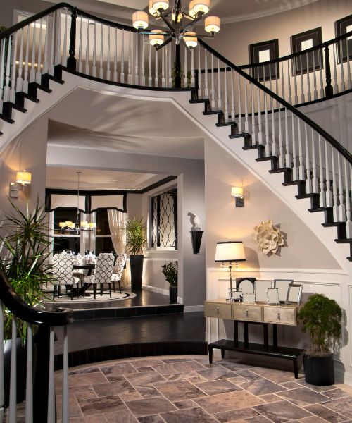 Proyek ini adalah desain interior untuk rumah tinggal yang mengusung konsep klasik elegan. Area foyer ditata dengan tangga melengkung yang megah, dilengkapi railing hitam putih untuk menonjolkan kesan mewah dan timeless. Penerangan hangat dari lampu gantung serta pencahayaan tambahan di dinding menciptakan suasana yang nyaman dan bersahaja. Detail ornamen, seperti elemen tanaman hijau dan furnitur dengan tekstur alami, memberikan nuansa hangat yang menyatu dengan desain keseluruhan. Proyek ini menunjukkan keahlian kami dalam menghadirkan rumah tinggal yang mencerminkan karakter pemilik dengan estetika yang berkelas.